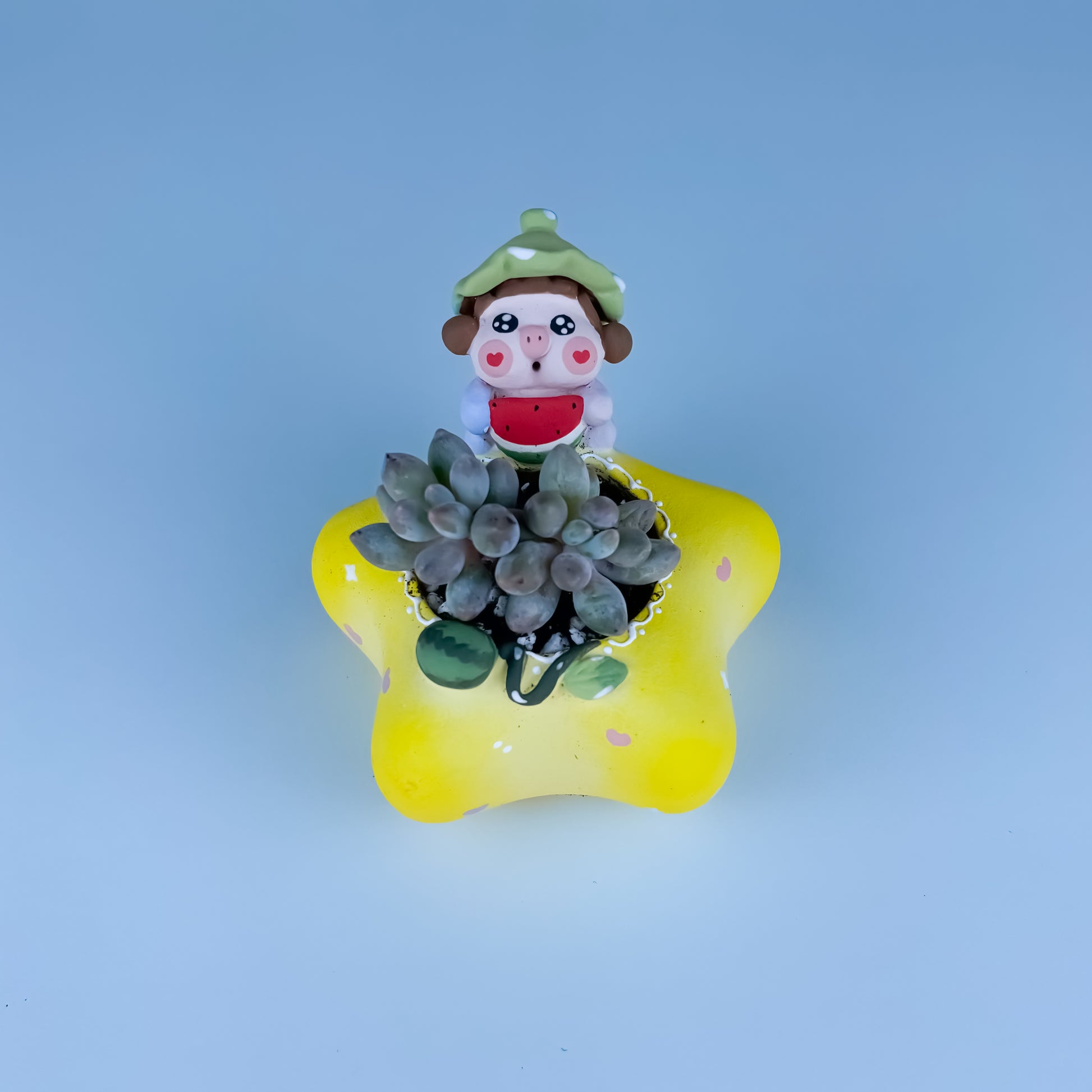 This handmade star-shaped pot is featured an irresistibly cute little piggy perched on the back. Each pot is uniquely crafted by hand, making every detail — from the piggy’s expression to its outfit — full of charm and personality. The unglazed finish gives it a soft, creamy texture that feels natural and cozy, while subtle touches of color bring it to life without losing its handmade warmth. Perfect for tiny succulents, mini cacti, or as a sweet decorative accent, this pot radiates happiness and rustic artistry.