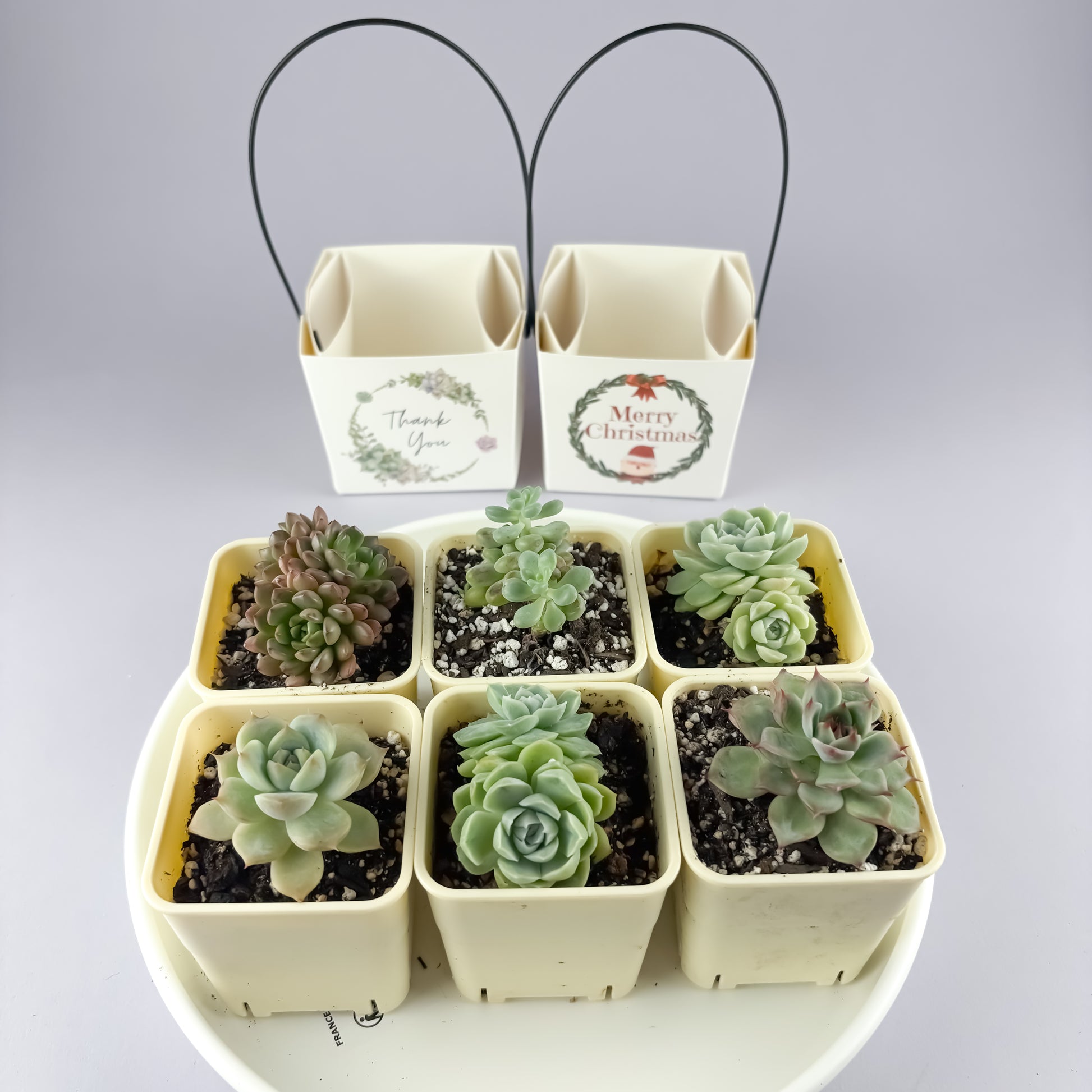 A charming succulent gift set perfect for thank-you gifts, party favors, special occasions, or a little treat for yourself. Each set includes a healthy, randomly selected succulent paired with a plastic grow pot and your choice of gift box—simple, cute, and ready to gift!